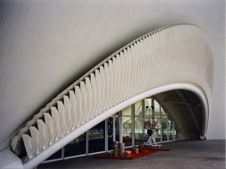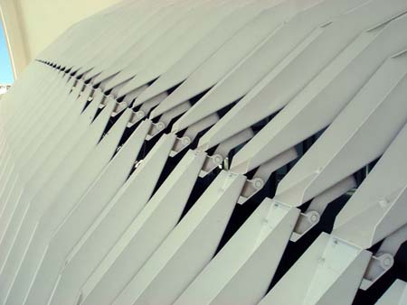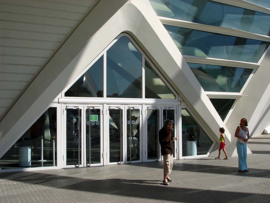 Lors d’une prévision de passage intense, pour fluidifier l’accès au musée, l’ensemble portes et triangle vitré supérieur, s’articule autour du tube médian horizontal sur 90°. |
